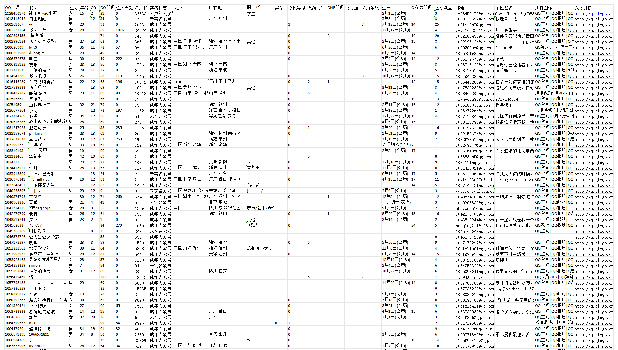 可以提取的信息有好友的QQ号、头像、昵称、地区、等级、实名状态、职业、生日等信息,非常详细